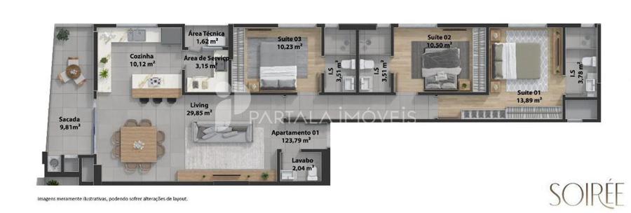 Tipo 1: 3 suítes | 123,79 m2